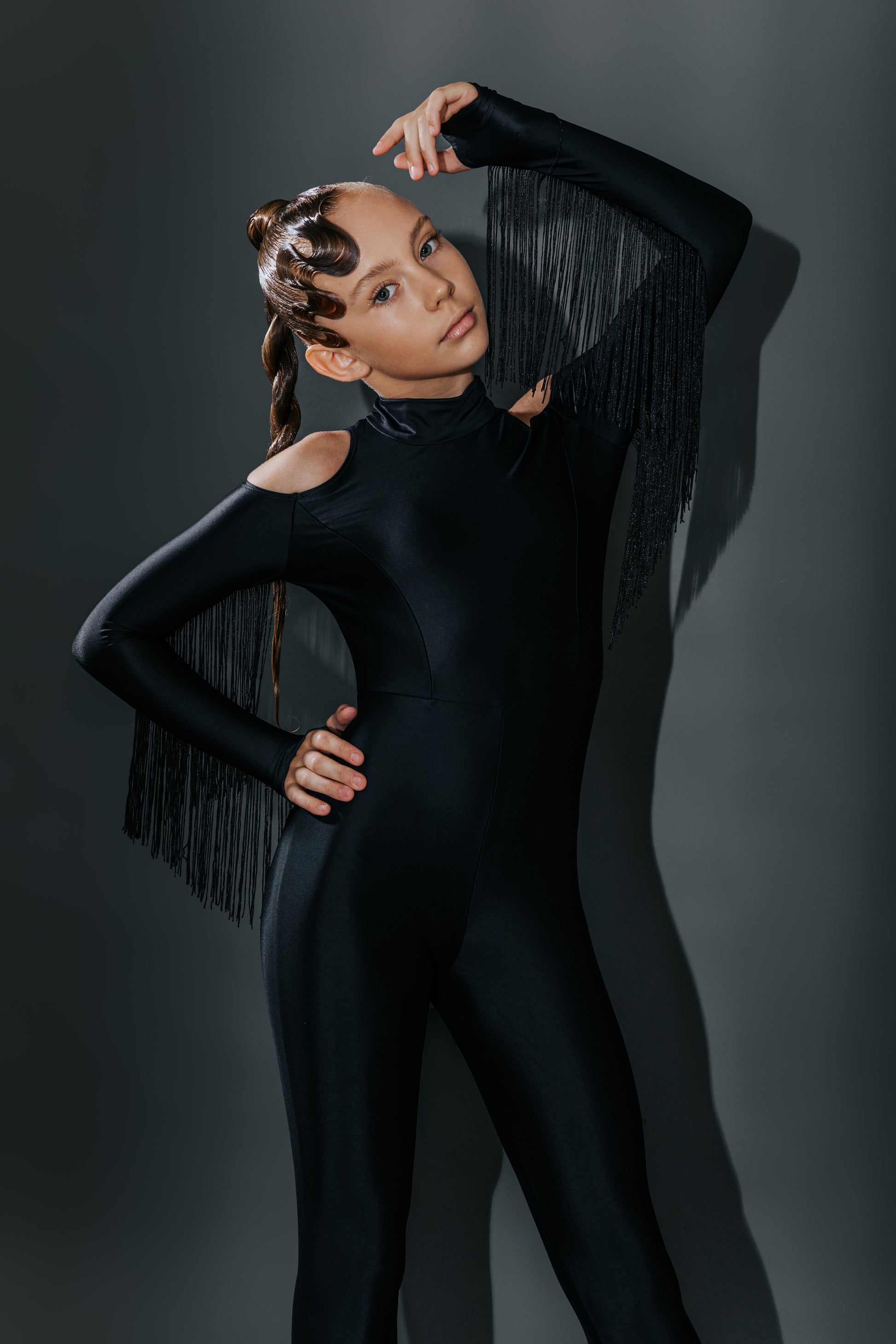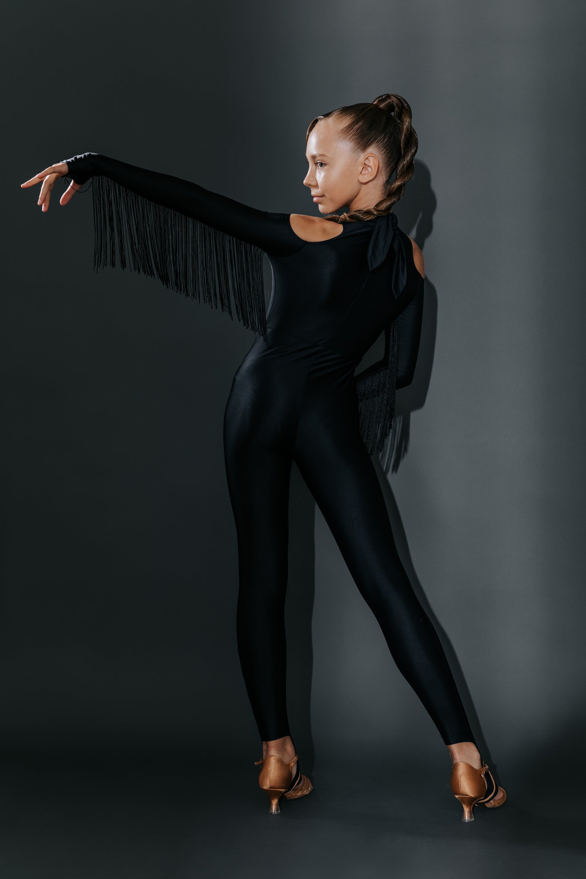 Prabangus juodas kombinezonas išsiskiria savo pečių iškirptėmis ir gražiai puoštomis rankovėmis. Jis turi ilgas elegantiškas rankoves su kutais, diskretišką užtrauktuką nugaroje ir stilingą kaklo juostelę.